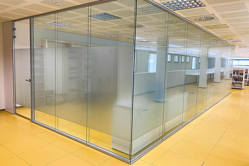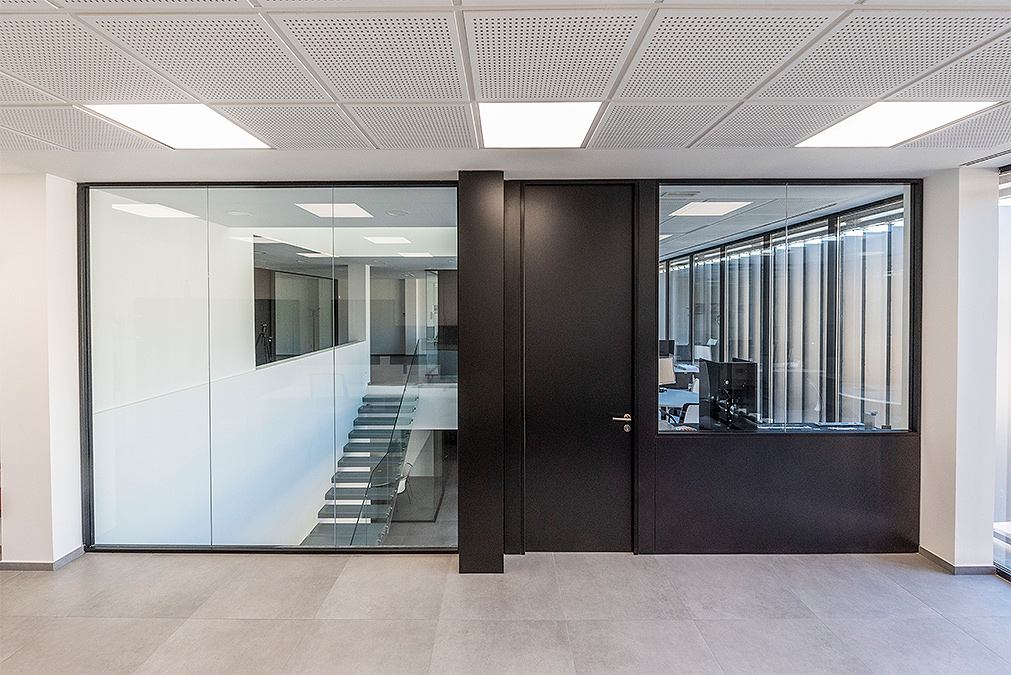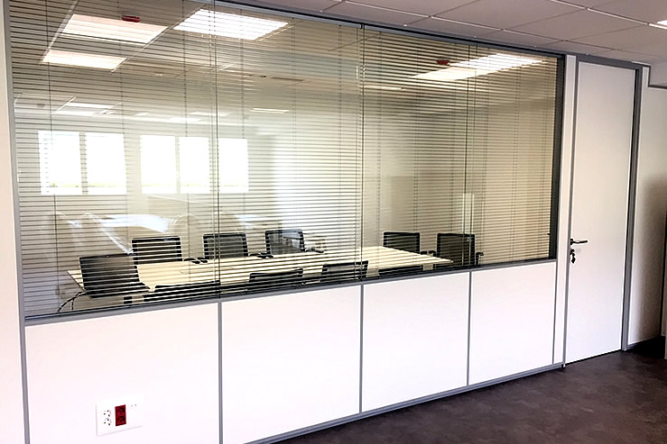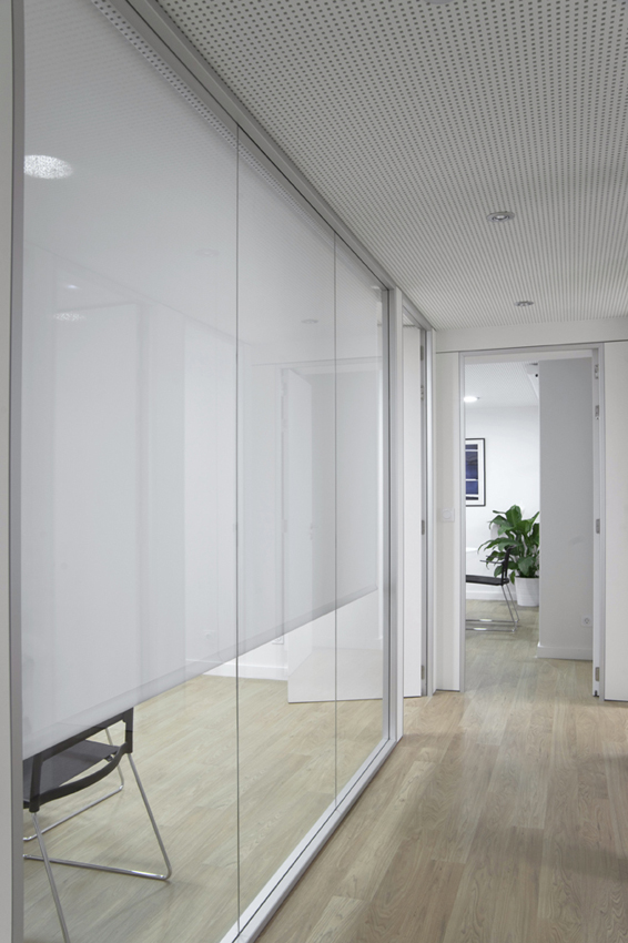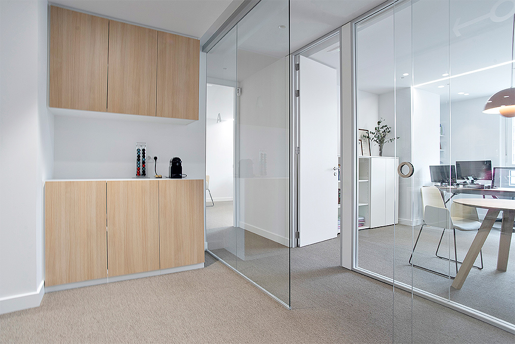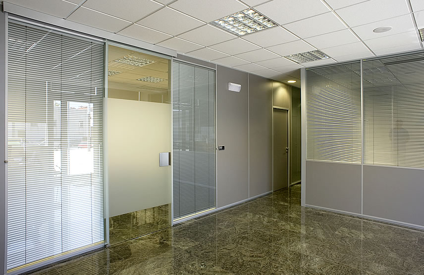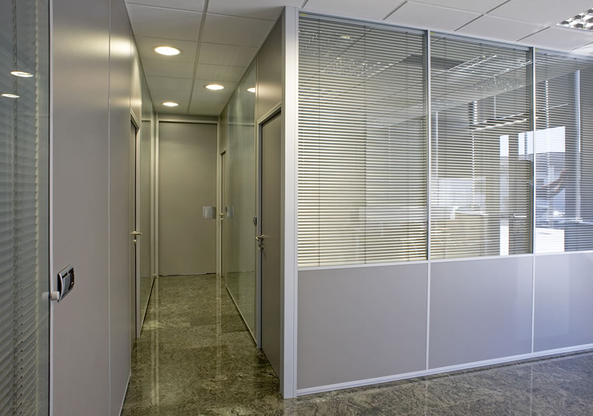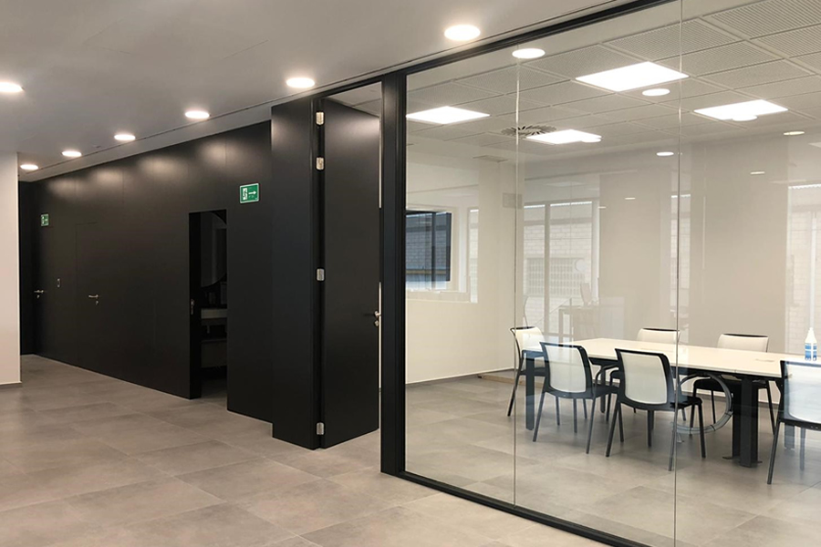 Nuestros sistemas de compartimentación modular pueden integrar los distintos tipos de soluciones en un mismo proyecto: doble vidrio, un vidrio simple y mampara ciega con modulacion vertical estandar u horizontal. Podemos aplicar una gran variedad de puertas: batientes, correderas y coplanares ó RAS tanto en ciegas como en vidrieras. También podemos aplicar Forrados de pared con los mismos acabados y soluciones que las mamparas y Tabiques Armario.